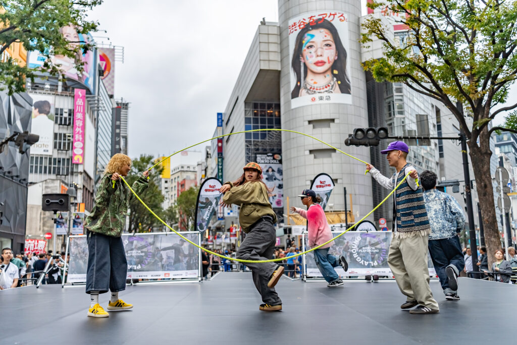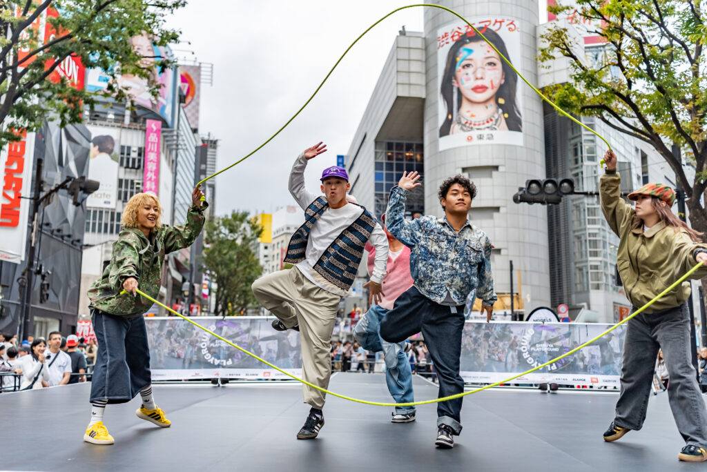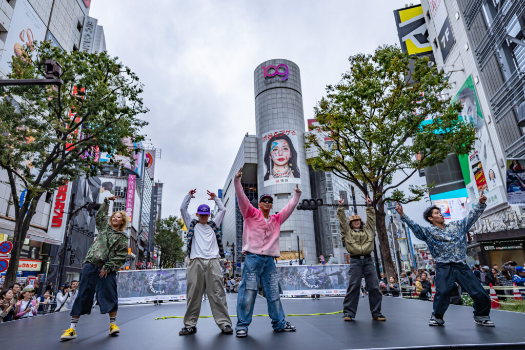 渋谷の街に広がる様々な公共空間でライブやパフォーマンスが行われる中、渋谷駅前のスクランブル交差点の路上に位置する「スクランブルステージ」にて、渋谷の象徴ともいえる109をバックに、ステージを囲う多くの観客へパフォーマンスを披露しました。